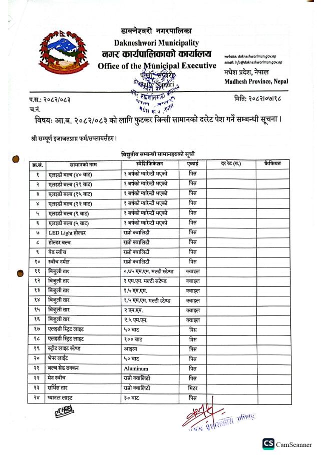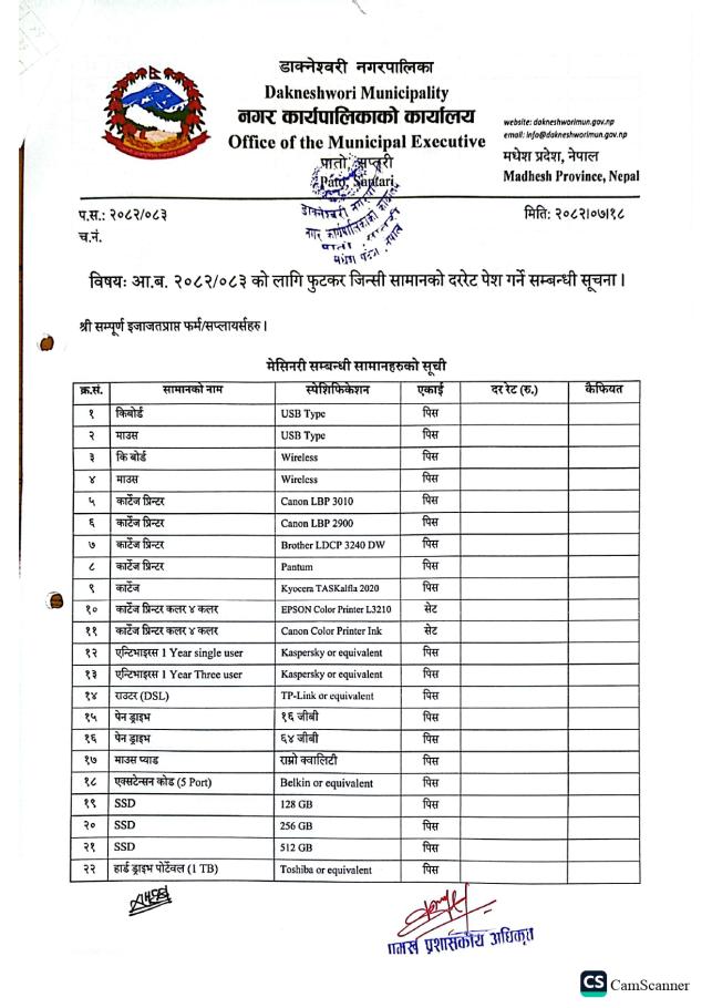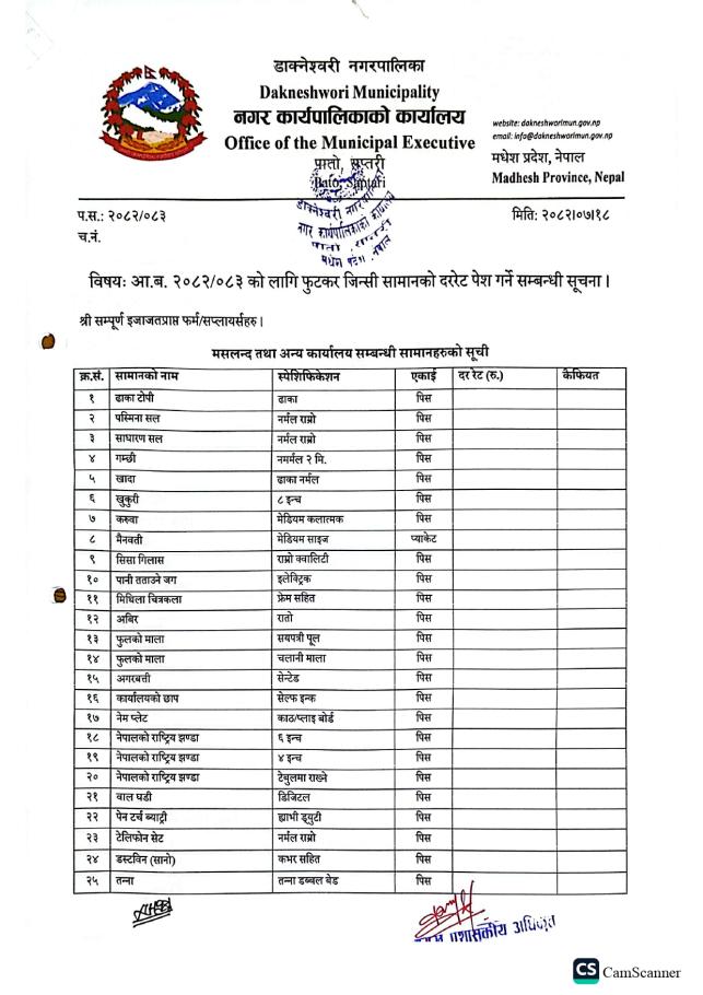 आ.व. २०८२/०८३ को लागि फुटकर जिन्सी सामानको दररेट पेश गर्ने सम्बन्धी सूचना