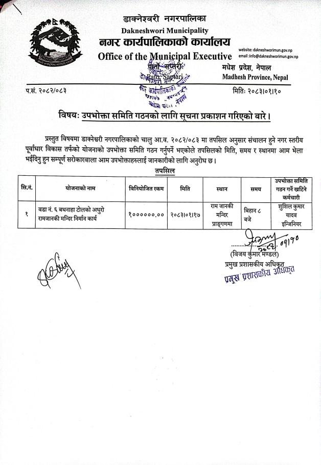 उपभोक्ता समिती गठनको लागी सूचना सम्बन्धमा।
