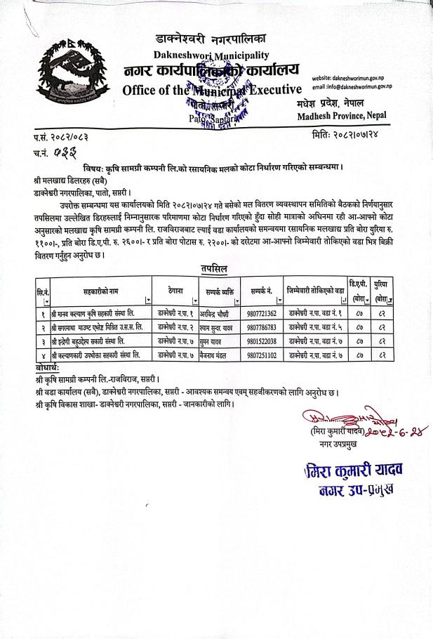 रासायनिक मलको कोटा निर्धारण गरिएको सम्बन्धमा ।
