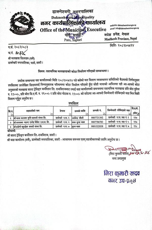 साल्ट ट्रेडिङ कर्पोरेसन लि.को रासायनिक मलको कोटा निर्धारण गरिएको सम्बन्धमा ।