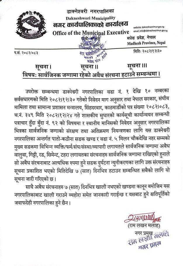 सार्वजनिक जग्गामा रहेको अवैध संरचना हटाउने सम्बन्धमा ।