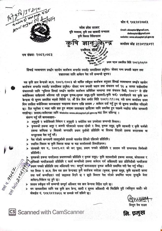 सिँचाई व्यवस्थापन प्रब्द्धन सहयोग कार्यक्रम अन्तर्गत स्यालो/समरसियल ट्यूवेल/सोलार पम्प प्रणाली जडान तथा सञ्चालनका लागि आवेदन पेश गर्ने सम्बन्धी सूचना
