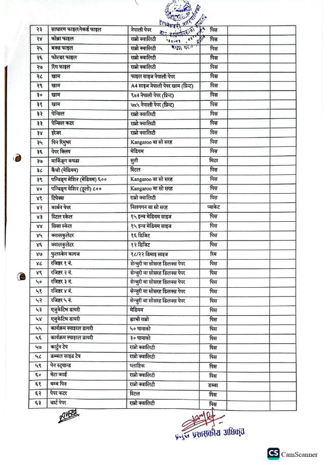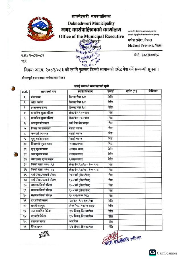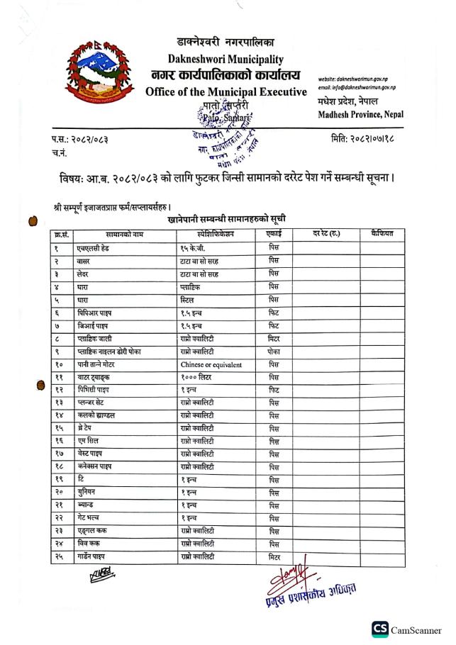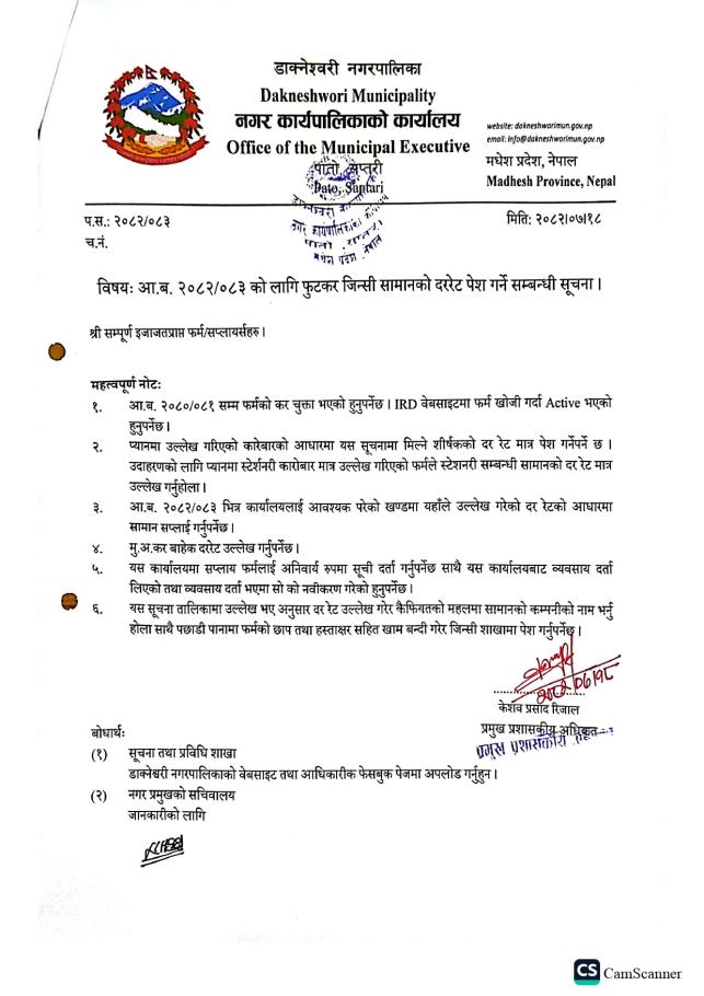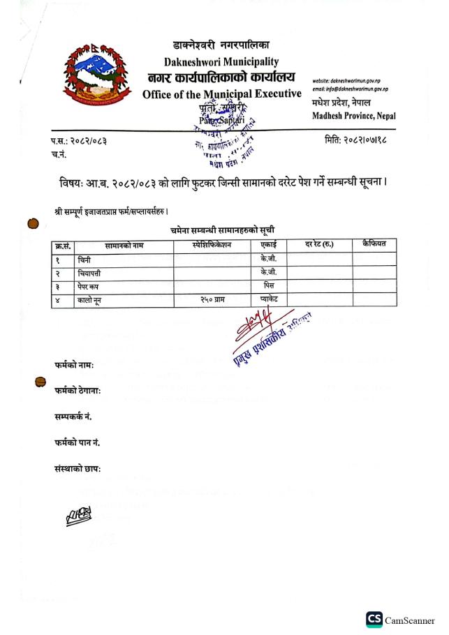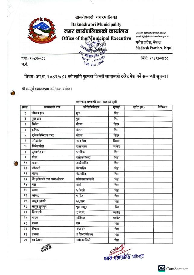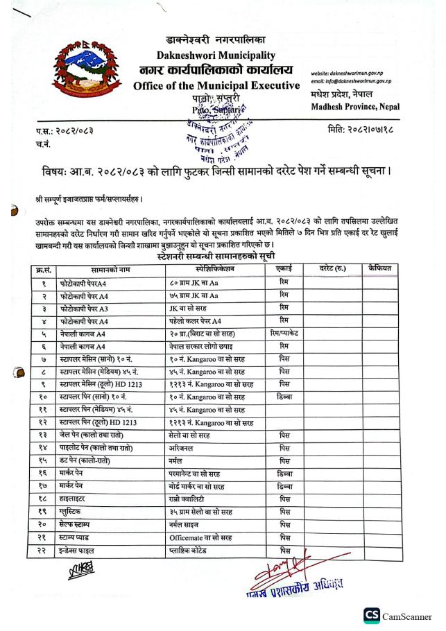 आ.व. २०८२/०८३ को लागि फुटकर जिन्सी सामानको दररेट पेश गर्ने सम्बन्धी सूचना