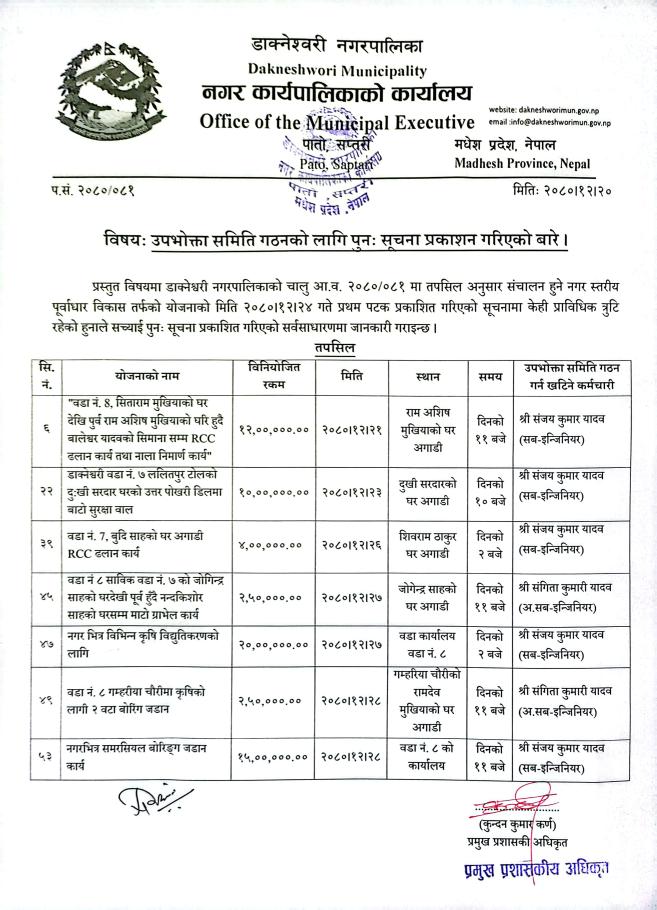 उपभोक्ता समिती गठनको लागी सूचना सम्बन्धमा।