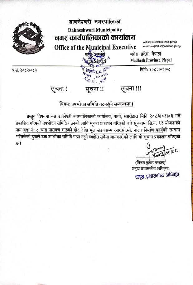 उपभोक्ता समिती गठनको लागी सूचना सम्बन्धमा।