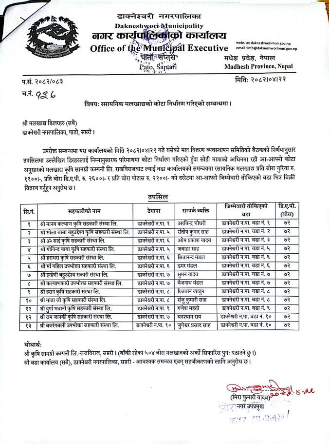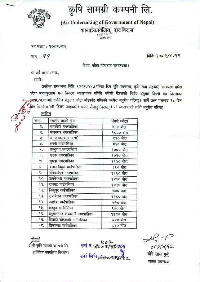 कृषि सामग्री कम्पनी लिमिटेडको रासायनिक मलखादको कोटा निर्धारण गरिएको सम्बन्धमा । 2