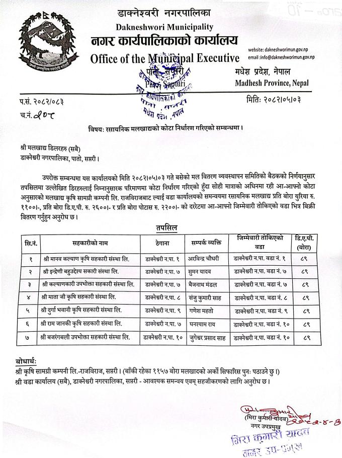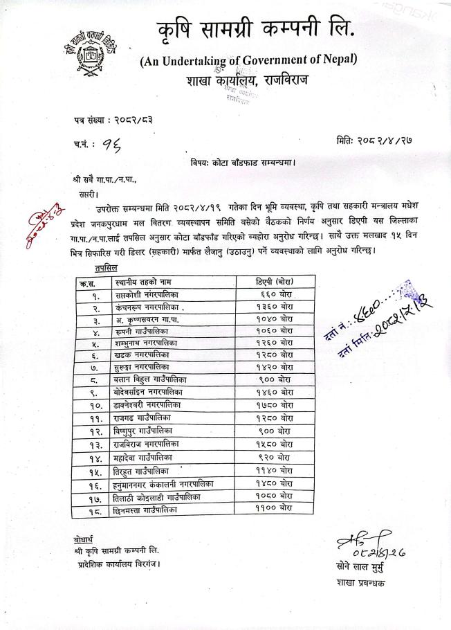 कृषि सामग्री कम्पनी लिमिटेडको रासायनिक मलखादको कोटा निर्धारण गरिएको सम्बन्धमा । 2