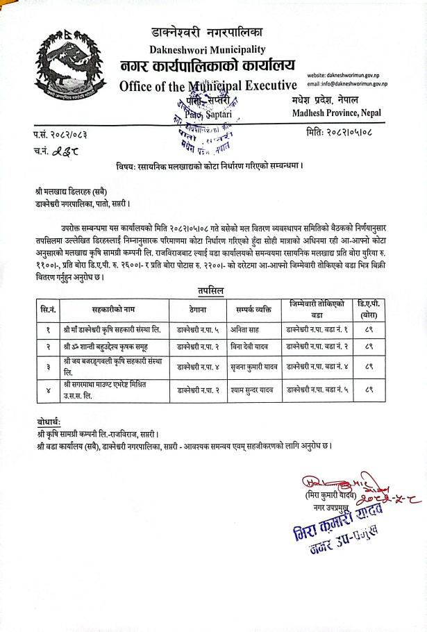 कृषि सामग्री कम्पनी लिमिटेडको रासायनिक मलखादको कोटा निर्धारण गरिएको सम्बन्धमा । 2