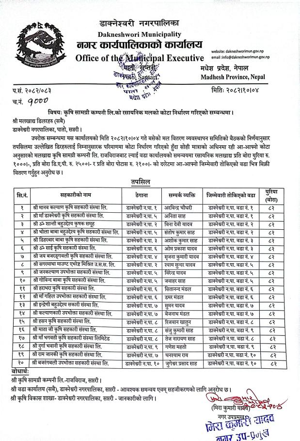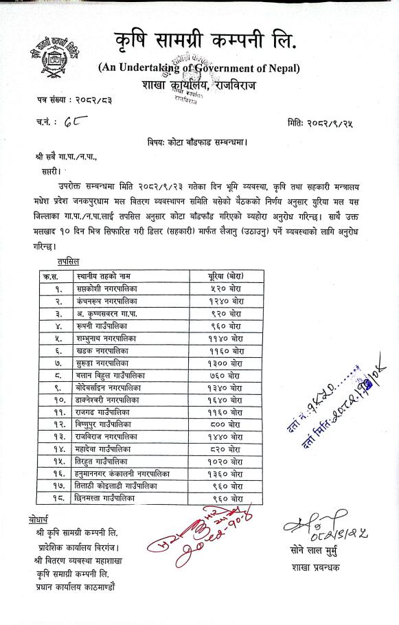 कृषि सामग्री लि. को रासायनिक मलको कोटा निर्धारण गरिएको सम्बन्धमा ।