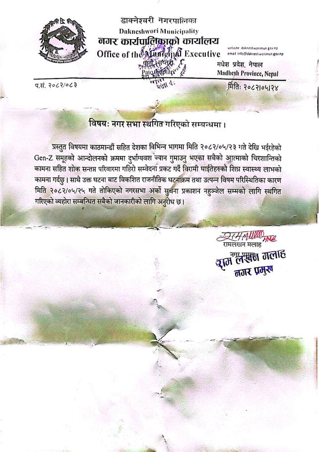 नगरसभा स्थगित गरिएको सम्बन्धमा ।