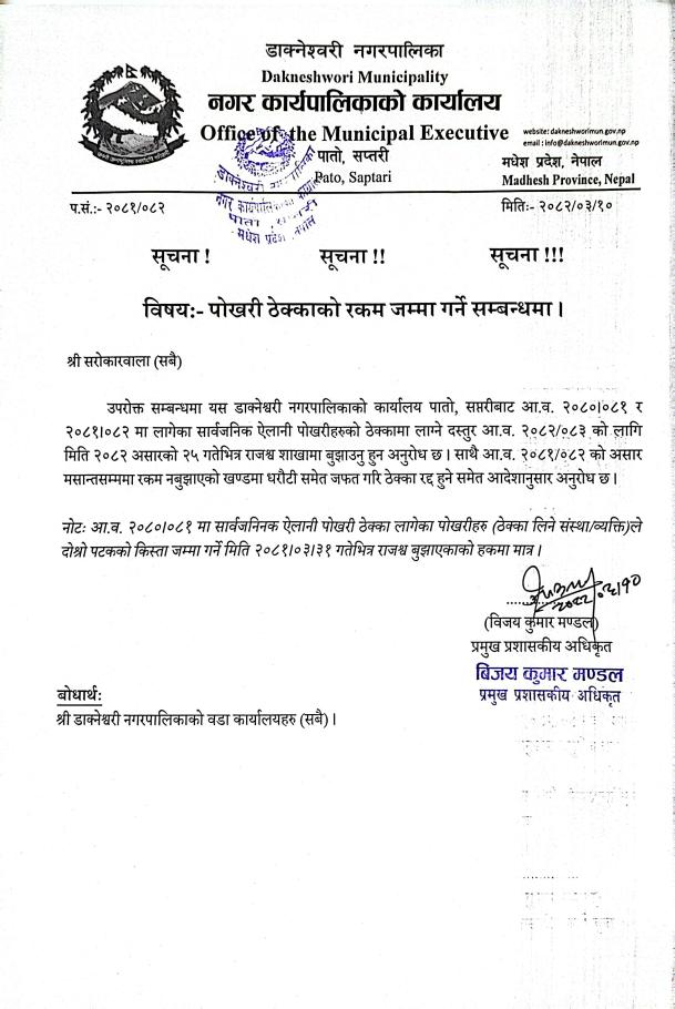 » पोखरी ठेक्काको रकम जम्मा गर्ने सम्बन्धमा ।