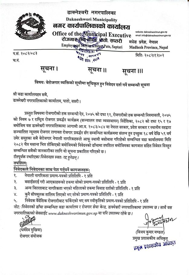 बेरोजगार व्यक्तिको सूचीमा सूचीकृत हुन निवेदन दर्ता गर्ने सम्बन्धी सूचना ।