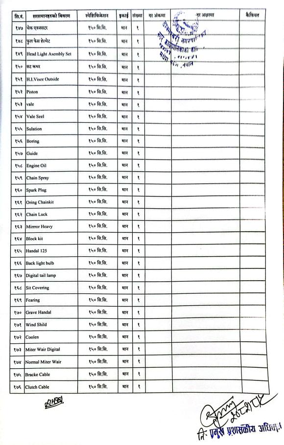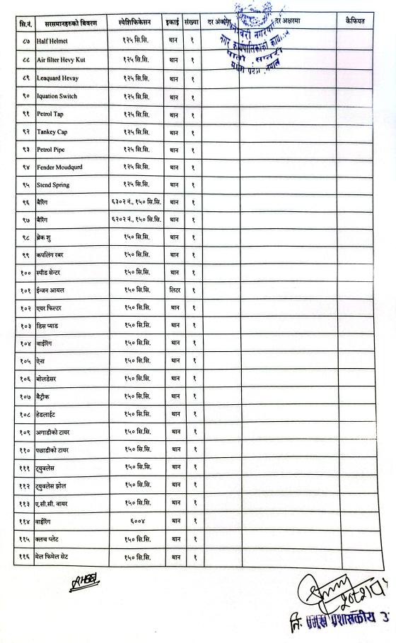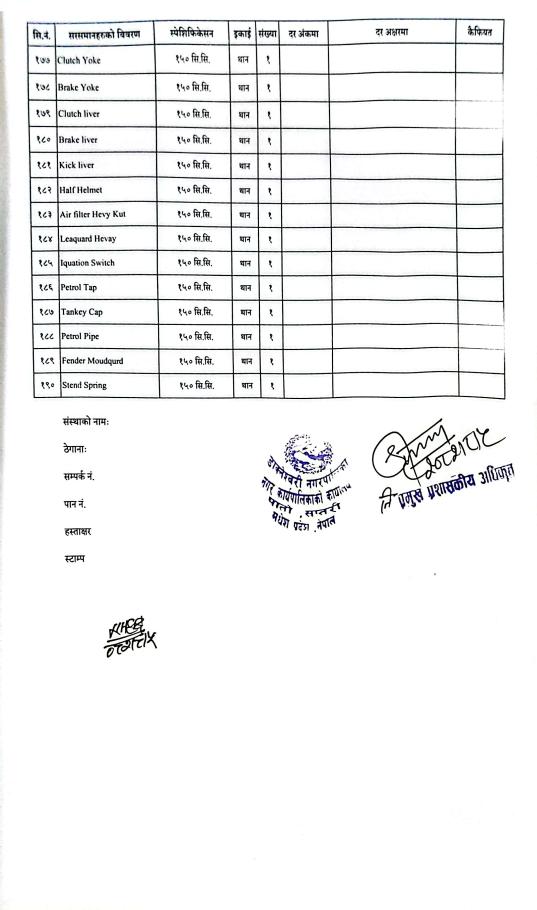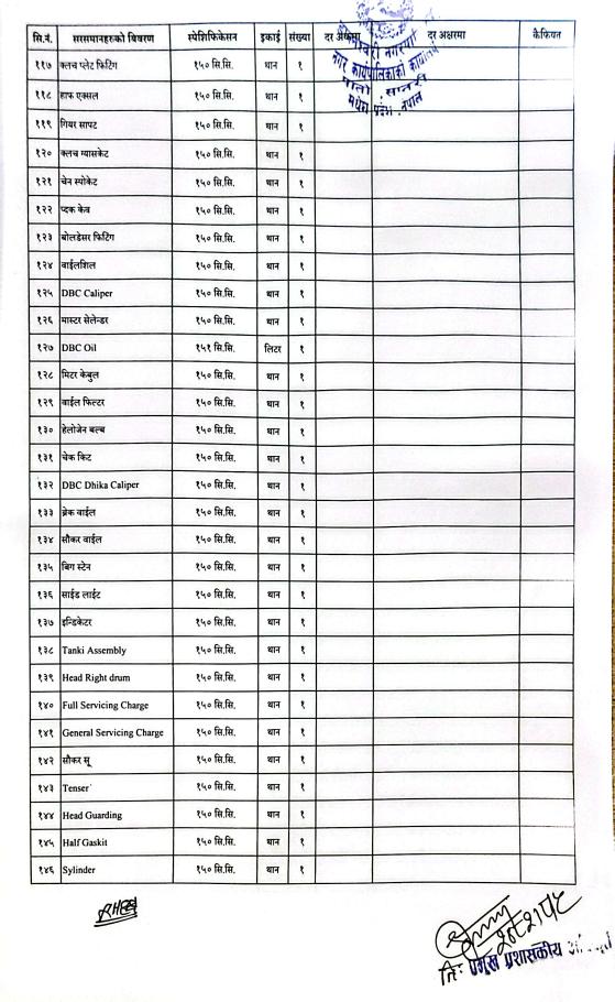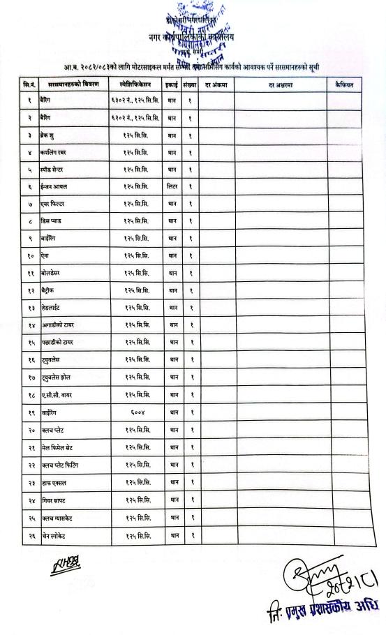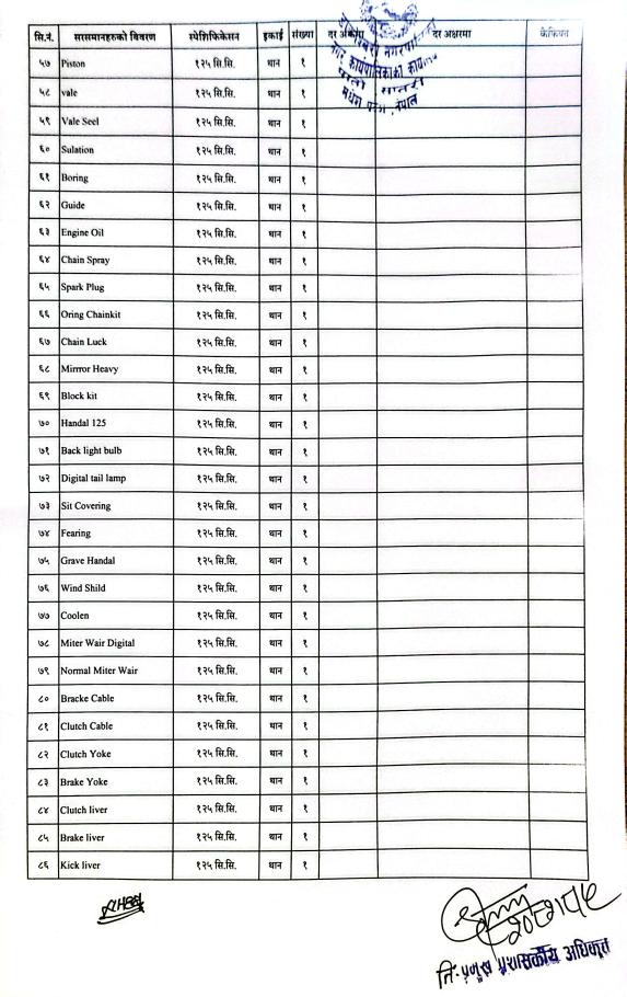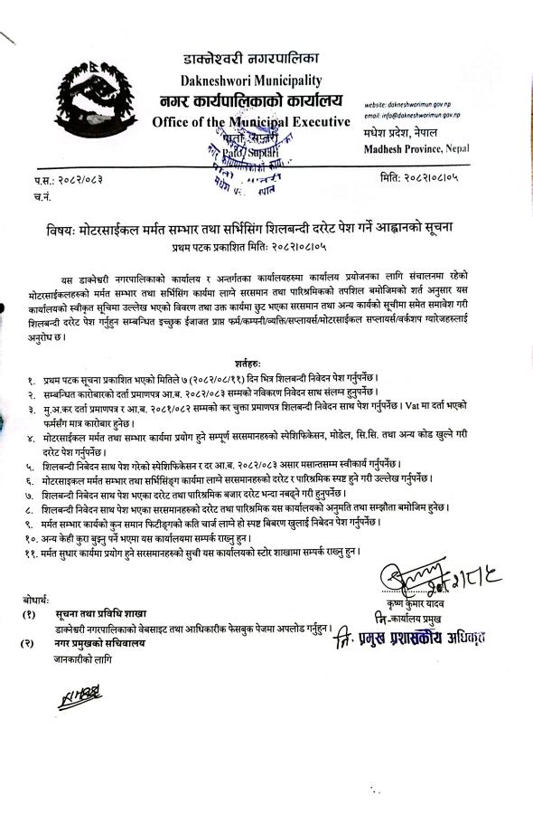 मोटरसाइकल मर्मत सम्भार तथा सर्भिसिङ्ग सिलबन्दी दररेट पेश गर्ने आह्वानको सूचना ।