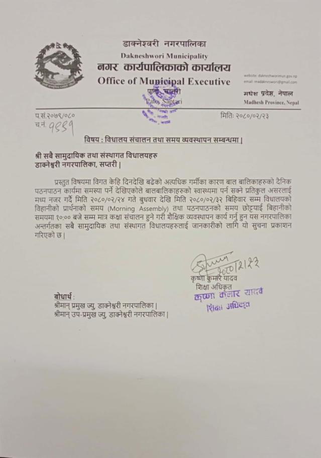 विद्यालय सञ्चालन तथा समय व्यवस्थापन सम्बन्धमा ।