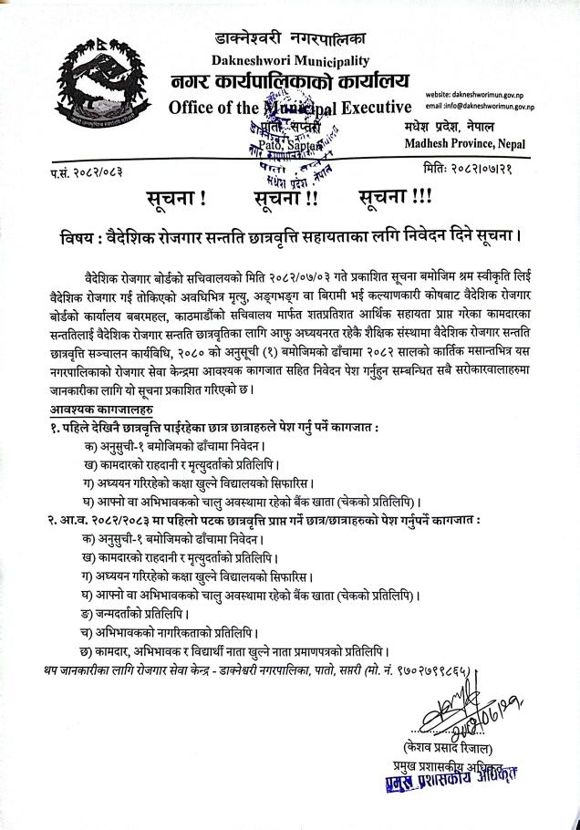 वैदेशिक रोजगार सन्तति छात्रवृत्ति सहायताका लागि निवेदन दिने सूचना ।