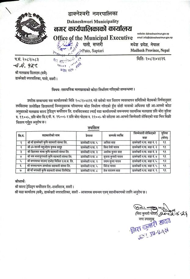 » साल्ट ट्रेडिङ कर्पोरेसन लिमिटेडको रासायनिक मलखादको कोटा निर्धारण गरिएको सम्बन्धमा ।